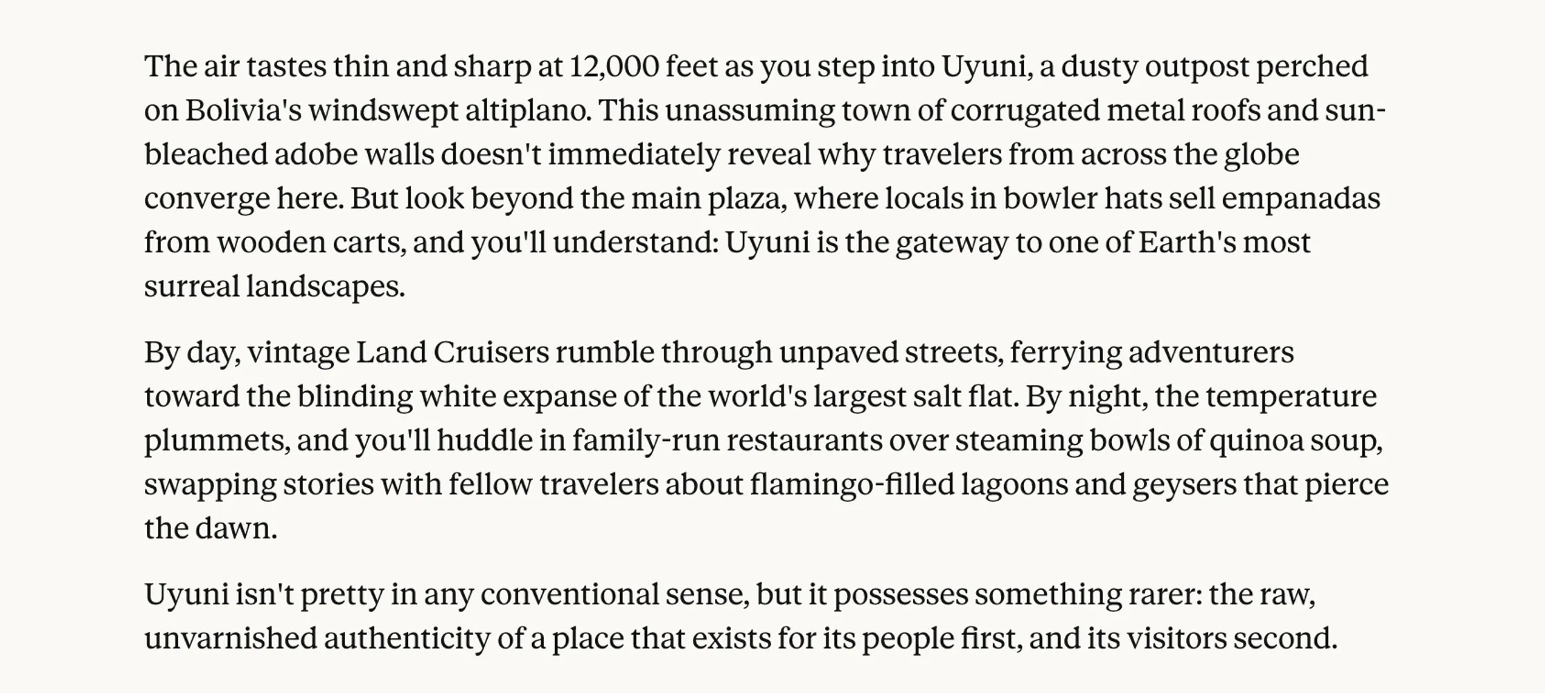 My problem, of course, is that Claude’s is passable. It’s specious: superficially plausible. You might even prefer it. To me it’s middle-of-the-road. Any edginess from the gazillion sources trawled by the LLM has been sanded down, lest we detect an author’s unique tone of voice. It’s laundered creativity.